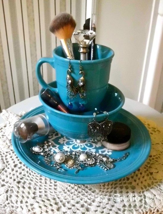 Now, seeing how no woman has ever been known to say, "I have enough jewelry, thanks," we tend to have an accumulated mass of random jewelry items. Some of it's in a jewelry box, some is in another box, some is on my dresser, some of it is on the cat... Upcycling old door knobs and cupboard handles makes for a gorgeous jewelry organizer in a pinch! (as seen in photo 4). If you'd rather have a holder that can sit on a surface rather than requiring to be hung up on the wall, (and perhaps you just happen to have multiple glass mugs hanging around or live next door to a thrift store), try out this project (as seen in photo 5). How cute is that?!? And if you're looking for something just a tad bit quirky, try turning branches into hangers for your necklaces and earrings (as seen in photo 6).