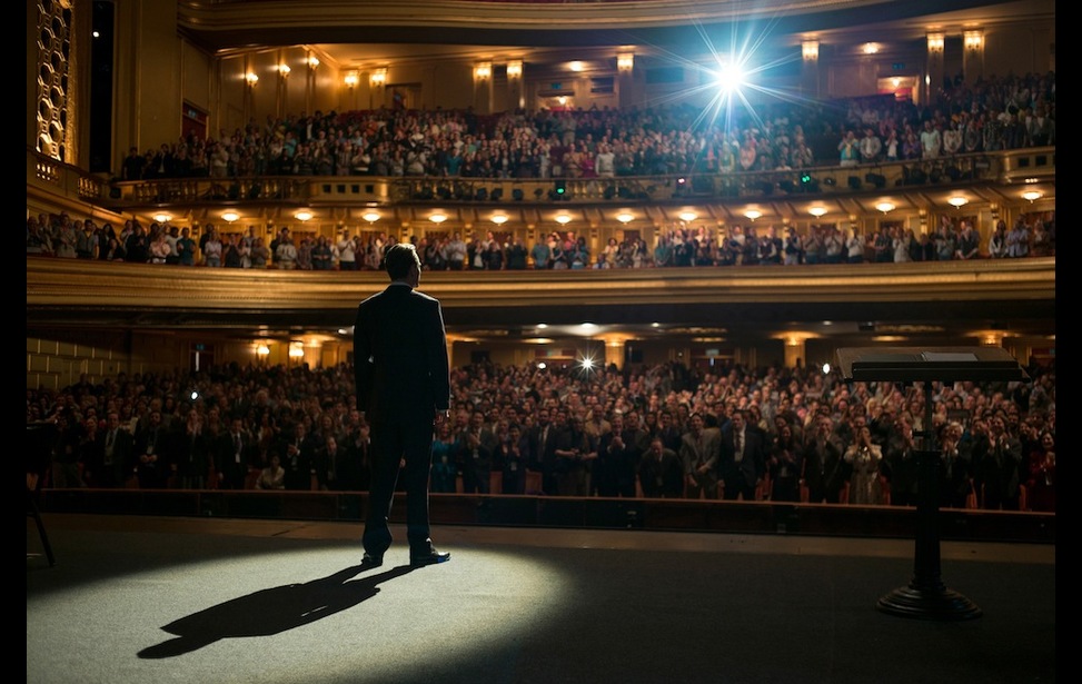As the narrative moves from the private to the public persona, the camera angles, flashes and spotlight all highlight Jobs' increasingly iconic status. As Küchler put it, "There's one shot in the end of Act II where he steps in front of the auditorium and you see his shadow on the floor like a cathouse. The flashes and the frozen moment tell the story of his being an iconic figure." Asked if he borrowed any tricks from propaganda guru Leni Riefenstahl, Küchler replied, "When he was Steve Jobs from the audience's point of view, we tended to pick lower angles looking up at him."