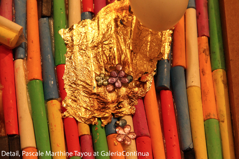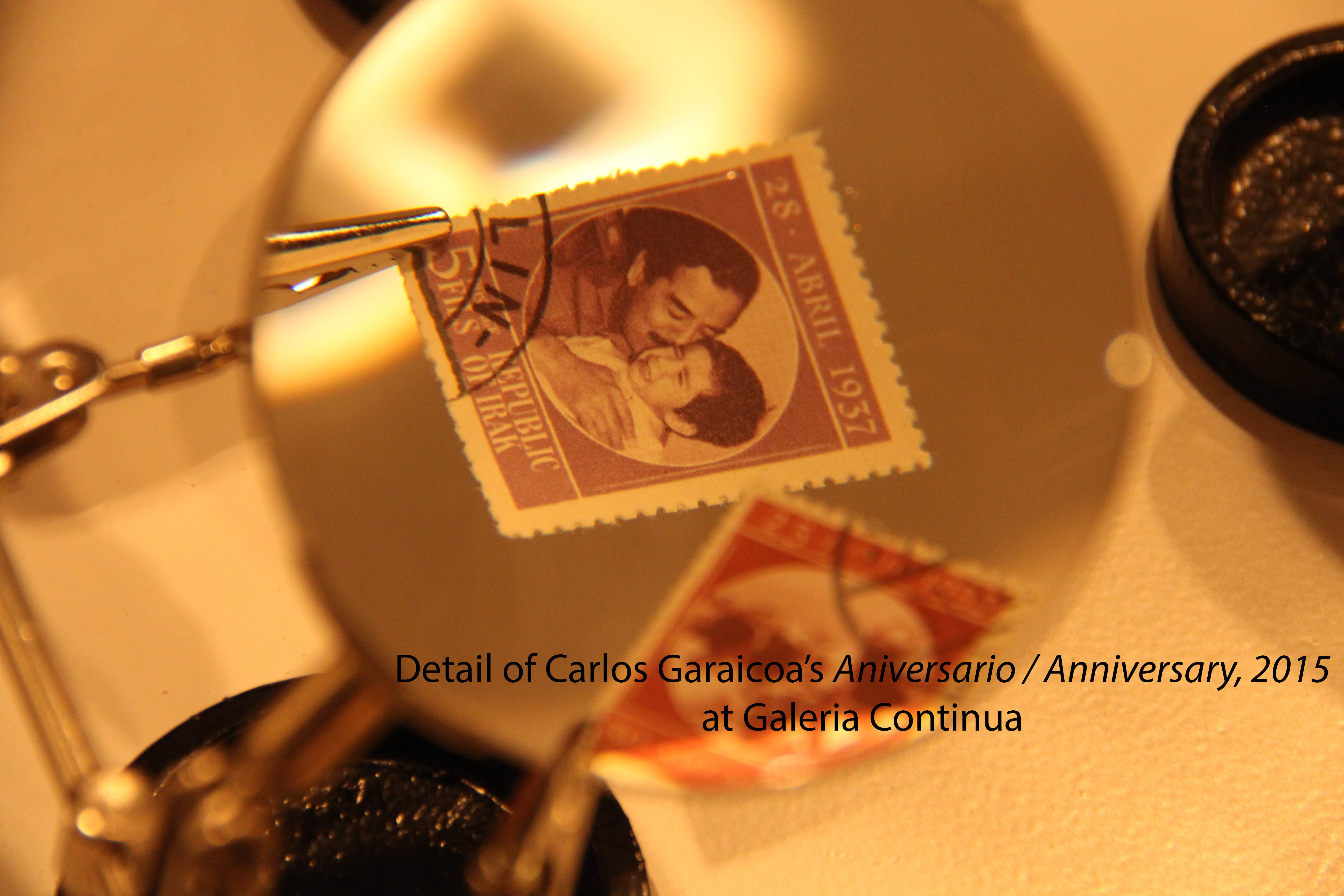 The James Cohan gallery also featured interesting works, particularly Fred Tomaselli’s Double Landscape, 1995, and Philip Handson’s O Rose Thou Art Sick (Blake), 2015. Personally, I love the writings of William Blake, and am captivated by all paintings inspired by poetry. Here the inspiration was William Blake’s poem, The Sick Rose. Moving on, I found the warm and fuzzy surface of Yinka Shonibare’s Wind Sculpture III Maquette, 2015 so welcoming, but upon closer inspection, the surface revealed itself to consist of a chilling and meticulous assemblage of large blades. Over in the Galeria Continua, I enjoyed the chance to practice my Italian with two visiting Florentine ladies, Cecilia and Maddalena, and then moved on to admire the works of Carlos Garaicoa’s Aniversario / Anniversary, 2015, an installation of stamps and magnifying glasses featuring iconic world leaders, many of them posing with crying children.