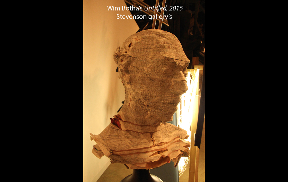 Finally inside the convention center, it behooves one to breathe deeply, then slow down and absorb the amazing sights while navigating through the rivers of swarming art aficionados. Today, I greatly enjoyed seeing Wim Botha of Stevenson Gallery’s approach to busts. One, Untitled, 2015, was created from encyclopedias, wood and stainless steel. The cross section shows gilded edges, perhaps suggesting an enlightened or elevated figure whose identity is intentionally concealed by ambiguous facial features.