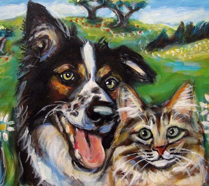 One look at Angie Ketelhut’s pet portraits brings to me so much joy and heartfelt emotion. The way she draws and paints animals truly portrays their pure, loving, innocent, happy, loyal, and intelligent personalities in a vibrant, unique, and expressive manner. Her love for animals shines in every single brush stroke. Customers from all over the world send her pictures of their furry family members, and she paints them in an array of happy settings.