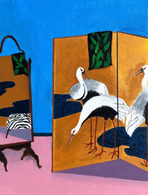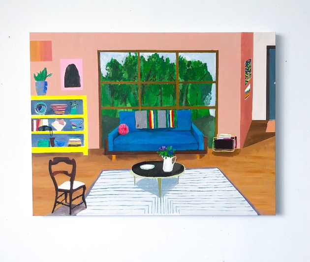 Polly Shindler: When I begin a painting, my attention is focused on the design of both the physical “room” as well as that of the painting. I create a space on canvas by using paint to convey the idea or “symbol” of a room. The spaces I depict are imagined and sourced mainly from images found in the real and digital world. My interest in creating these rooms grew first from an investigation of solitude and retreat, and then to a narrower focus on composition and more formal concepts. I consider color, pattern and texture in an architectural and art historical context in creating each work. My interest in both classical styles and modern designs create a scaffold for the space I want to construct and these decisions dictate the room’s feeling and atmosphere.