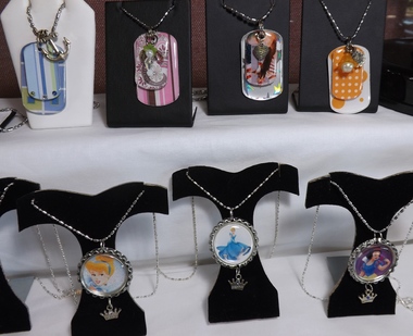 Palumbo also owns DeJae’s, an online shop selling unique jewelry and accessories. But what she was showing at the craft show was even cooler: handmade glass-mounted (as seen in photo 1) or acrylic-coated necklaces, in geometric shapes or on dog tags and bottle caps.