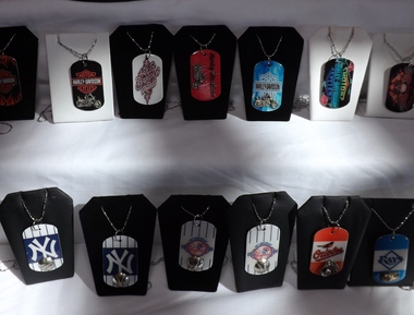 Each piece takes several hours to make, although she does them in batches of 80 to 100 over the course of a few days. The prices were a very reasonable range of $6.95 for bottle cap designs to $18.95 for double dog tags.