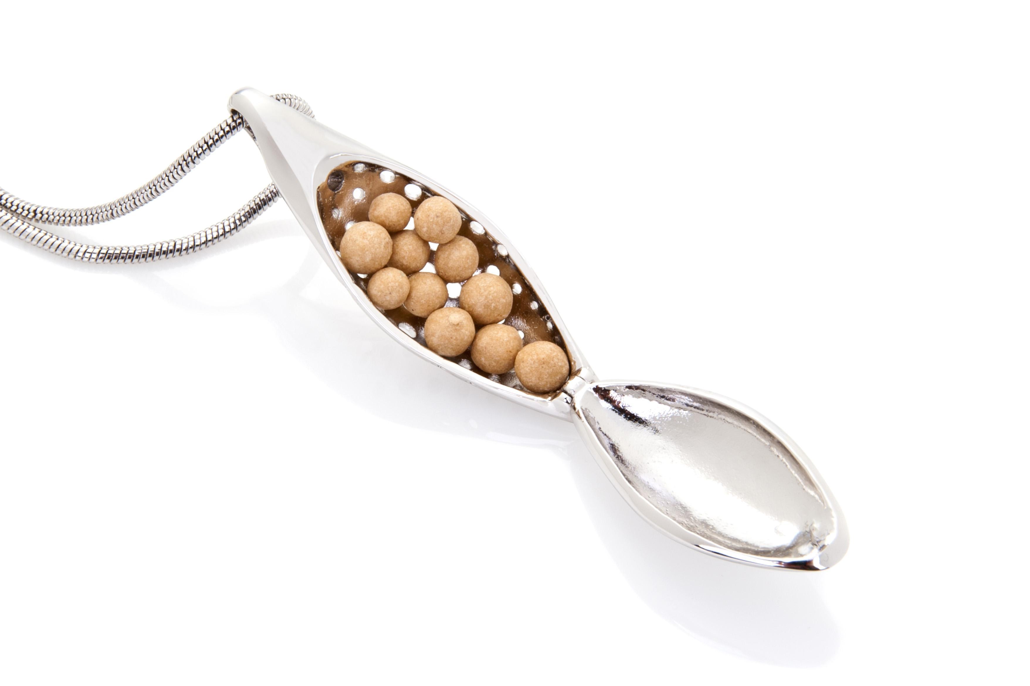 Using a concept similar to that of aromatherapy, the scents are slowly released using vents in the jewellery which mimic champagne bubbles. Each design is available in five metal finishes each one paired with one of Lisa Hoffmans scents. The French Clary Sage range (as seen in photos 3 - 7), is matched with silver. French Clary Sage has soothing and confidence boosting properties. The wooden beads are biodegradable and refillable. In order to refill the pendant necklace for example, you simply unlatch the pendant (as seen in photo 7). Other designs include Tuscan Fig with rose gold and Japanese Agarwood with espresso bronze