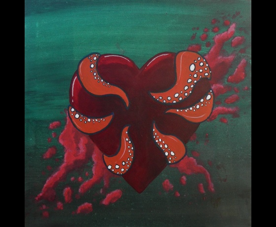 Pulsating love in a tentacle's grip. Acrylic painting over a watercolor background.