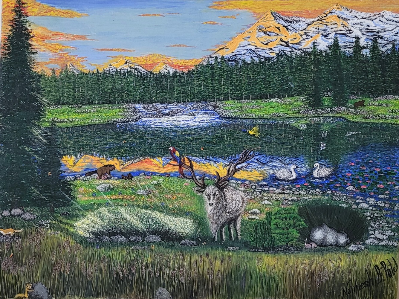 This painting is motivated by the desire to see the nature from where I can see those beautiful gold glowing mountains behind the bushes of pine trees. It's like spring have arrives, sun have already started to melt the snow, which made the rivers start's to flow again and a beautiful water fall emerges from the bushes of pine trees on stones of can be seen in a lake. Parrots are flying in groups, and one of them stop to say morning to this young furry deer with beautiful hones. It's look like weaver and her babies are working to make dam. Tiny Fox is coming towards me by hiding through big stones and grasses in dark and skunk too. I am blessed bear is far away on another side of lake shore. Beautiful pink lotus have bloom with the morning sun light. Ohh look, there is nice couple of swan floating in lake near lotus.